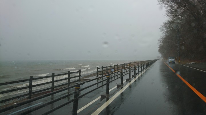 写真は午後2時、車の助手席から山中湖を撮りました。晴れていれば、富士山が見える場所なのですが、強風で波が立っています。運転には気を付けてくださいね。