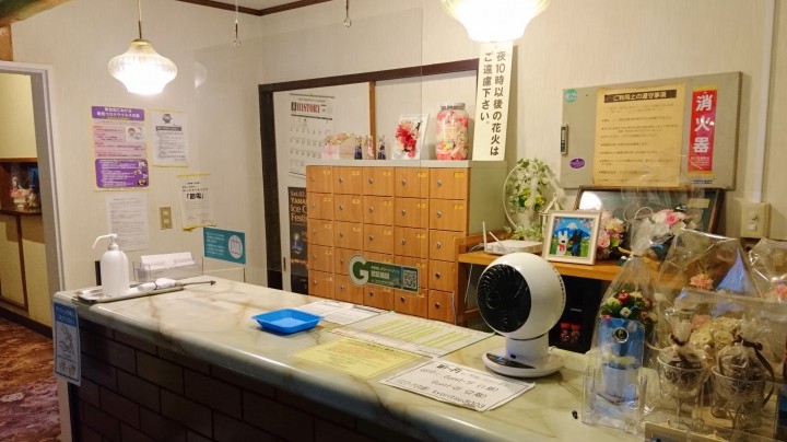 ・対面による飛沫感染防止のため、フロントにアクリル板を設置しております。アクリル板の右下に、山梨グリーン・ゾーンの認証シールを張ってあります。