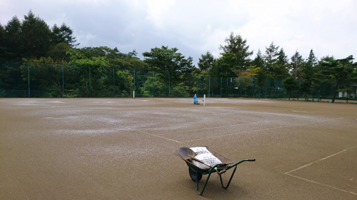 テニスコートに塩化カルシウムを撒きました。