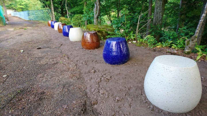 今日はテニスコート入り口に、陶器製イスを並べてみました。青色と白色の他に、先日仲間入りした茶色い陶器イスを合計9個並べました。なかなかいい感じです。機会を見て足元に化粧砂利を敷いて完成です。お越しの際はぜひ活用してください。今日の山中湖は晴れのち曇り、最高22℃最低15℃