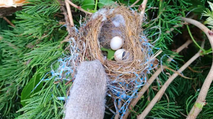 剪定中に鳥の卵を発見。