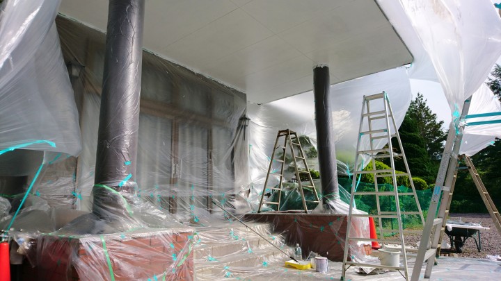 当館では現在、玄関をきれいにしています。入り口の軒天を一部張り替えてからの塗装工事です。シーラもしっかり2回塗りしてからの白ペンキ3度塗りです。真っ白にきれいになった入り口から皆様をお迎えしたいと思います。今日の山中湖は晴れ、最高気温28℃最低16℃20/06/15