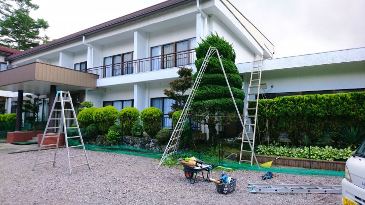 今日の山中湖は曇り午後からは雨、最高気温19℃最低13℃。当館では今日から敷地内の剪定を開始しました。毎年、シーズンが始まる前のこの時期に庭やコート周りの剪定を行っています。梅雨の最中ですので天気を見ながらの作業で、今日は雨のため裏玄関だけ、写真のように丸い木にしてみました。