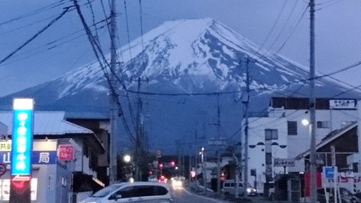 今日富士吉田市に行ってみると、農鳥が見えました。農鳥とは4月後半〜5月中旬頃に、富士山の7、8合目あたりに現れる鳥の形をした残雪のことです。昔から、農鳥が見えると田植えなど農作業をする目安ともされていたようです。今では農作業が早まって、農鳥が出現する頃は、田植えが行われるタイミングとのことです。写真は午後6時50分、薄暗い中の農鳥でした。今日の山中湖は晴れ、最高23℃最低6℃