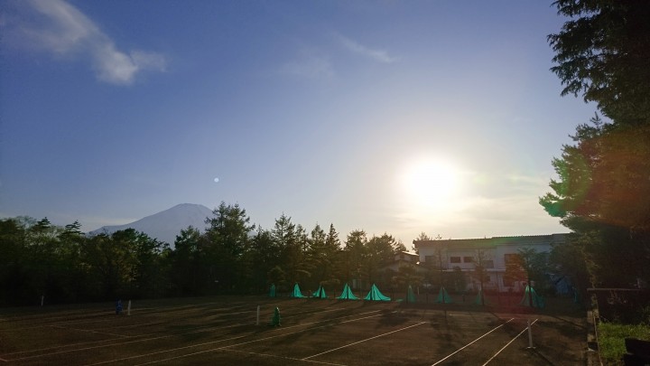 当館施設の周りは山中湖の大自然が広がっています。周りには建物がなく、あるのはテニスコートのみ。ひっそりと仲間たちだけでテニス合宿などいかがですか。音楽合宿、天体観測合宿など文科系合宿、ゼミ合宿もお任せください。とても静寂な宿です。高校・大学生活の思い出作りをお手伝いします。皆様のお越しを心よりお待ちしおります。貸し切り等のご相談もお気軽にどうぞ。写真は午後5時30分、山中湖の最高気温24℃、暑い1日でした。20/05/14