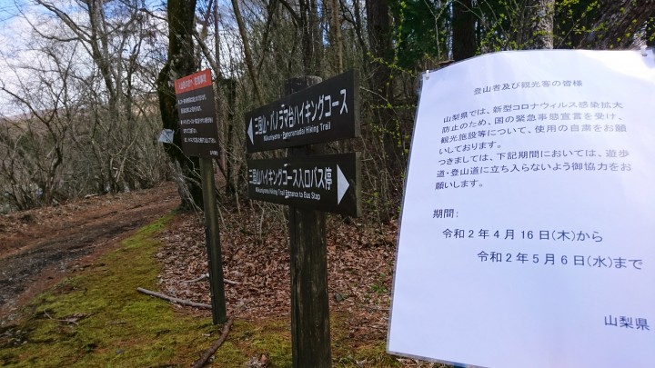 新型コロナウイルスの感染爆発を食い止めるため、政府は本日16日、緊急事態宣言を7都府県だった対象地域を全国に拡大しました。期間は5月6日まで。写真は、山中湖平野に設置された、遊歩道・登山道に立ち入らないようにとのお願い看板です。他人に迷惑となる行為は避けましょう。今日の山中湖は晴れ、夕方から小雨、今朝の最低は―0℃最高14℃。