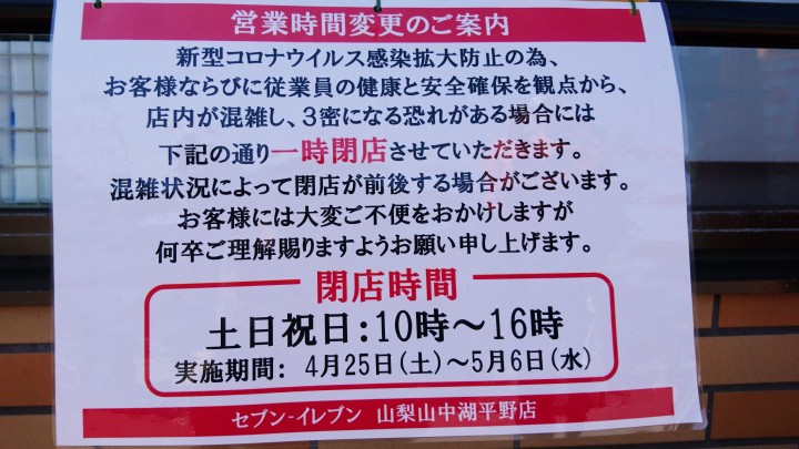 新型コロナウイルス感染拡大防止のため、地元のセブンイレブン山中湖平野店が営業時間を期間限定で変更することとなりました。閉店時間:10〜16時。実施期間:4/25〜5/6。大変不便となってしまいますが、仕方がないと思います。コロナに掛からないように、そして他人に迷惑にならないように気を付けたいですね。今日の山中湖は晴れ、最高気温は13℃、最低−2℃20/04/25