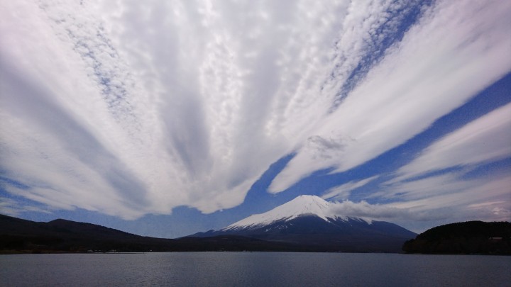 本日12時、山中湖畔に行くととても面白い雲に出会いました。富士山に向かって伸びている雲群、とても奥行きがある雲群です。一緒に行った仲間も一斉に写真を撮っていました。雲は想像もつかない形になるので、とても大好きです。今日の山中湖は晴れ、最高気温14℃最低1℃