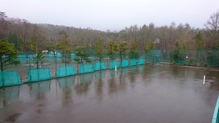 今日の山中湖は雨となりました。朝4時から15時まで、総雨量50mm。今年の4月は天気が悪く、テニスコートが全然乾きません。テニスコートをトラクターで掘り起こしているため、強い日差しがないと雨に打たれたコートの乾きが遅く、テープの設置がなかなかできません。今年はコロナの影響でお客さんがいないのでゆっくりとテープ打ちをしようと思います。