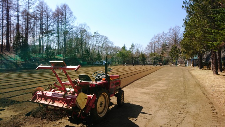 今日はNO.8〜10コートにトラクターで掘り起こし作業を行いました。今朝も霜が降りたため、作業は午後から行い、ローラ転圧まで行いました。No.5〜7コートについてはアングル掛けとローラー転圧まで完了、あとは雨を待つばかりです。明日から6日間雨予報となっていますので、何とか全コートの掘り起こしが出来て良かったです。今日の山中湖は晴れ、今朝の最低-2℃最高18℃。20/03/26