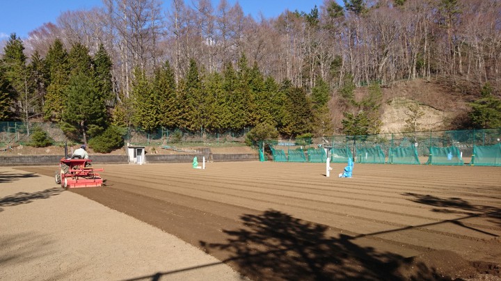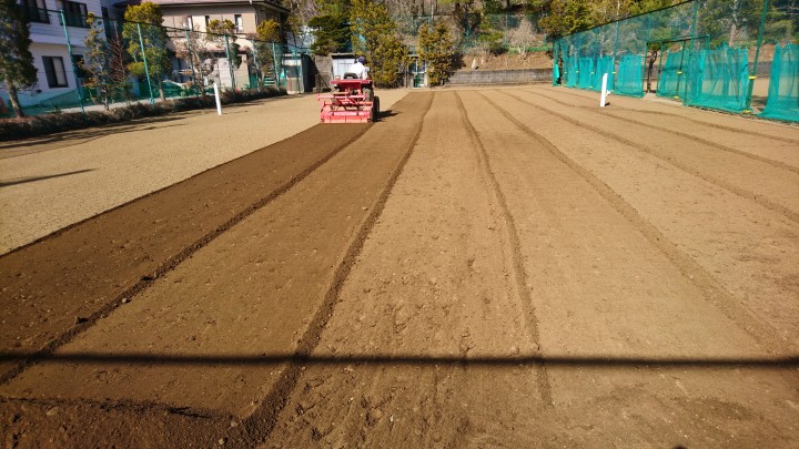 今日はNO.2〜4コートにトラクターで掘り起こし作業を行いました。今朝も霜が降りたため、作業は午後から行い、ローラ転圧まで行いました。予報では28日から5日間雨ですので、それまでに掘り起こしとアングル掛け作業を終わらせたいです。