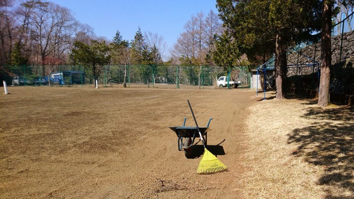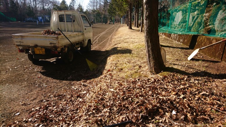 春の陽気となりました。テニスコートの落ち葉や枝拾いを再開です。