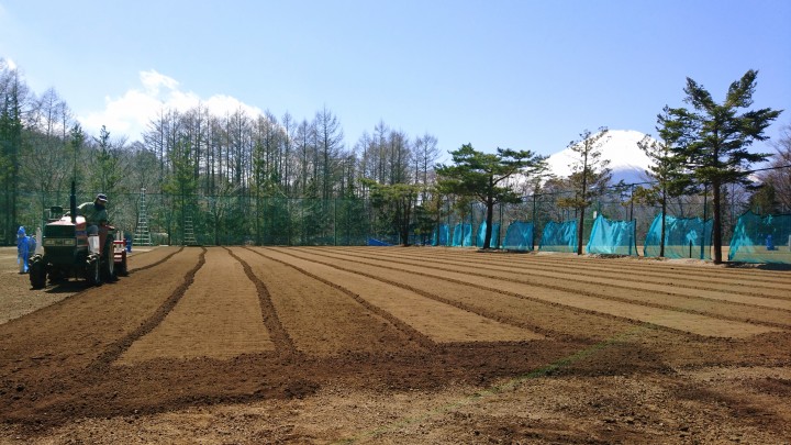 今日はNO.5〜7コートにトラクターで掘り起こし作業を行いました。今朝も霜が降りたため、作業は午後から行い、ローラー転圧まで行いました。No.2〜4コートについてはアングル掛けとローラー転圧まで完了、あとは雨を待つばかりです。28日から雨が5日間続く予報なのでそれまでに全コート、掘り起こし作業とアングル掛けまで行いたいです。今日の山中湖は晴れ、今朝の最低−7.4℃最高13℃