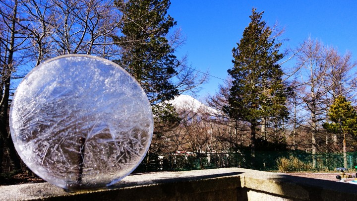 今朝の山中湖は−8℃まで冷え込み、バケツの水がカチカチに凍ていました。写真はその氷を富士山と一緒に撮ってみました。なんか面白い写真になりました。日中はよく晴れて最高気温は11℃、風がややあって無風だとポカポカでした。