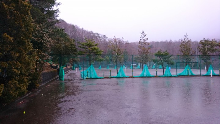 今日の山中湖は今朝から雨、午後はかなりの大雨となりました。写真は午後4時30分、コートは大雨でプール状態です。雨は9時頃止んで総雨量50mmでした。春になるにしたがって、天気は不安定です。春に3日の晴れなし、春の天気は3日と続きませんね。最高気温16℃最低5℃、暖かい雨の日でした。