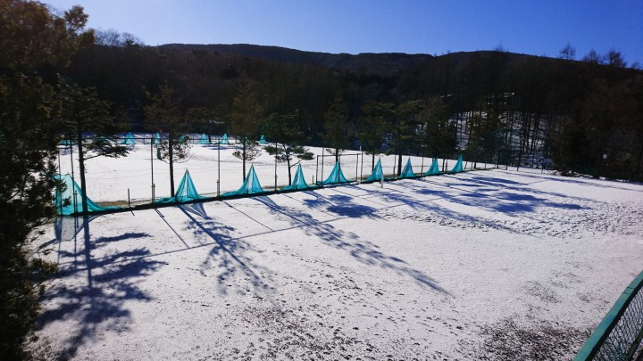 今朝は今季最低の−11.9℃、本当に寒い朝でした。でも今年は暖冬で雪が降っても解けるのが早いです。1月28日に積雪45?あった当館ですが、今は日向部分では解けて日陰に雪がある感じです。写真は10時30分、当館展望台から富士山を撮ってみました。テニスコートの半分が雪で覆われている感じでしょうか。ここ数日寒かったのですが、来週は暖かい予報なので一気に解けるかもしれません。最高3℃。