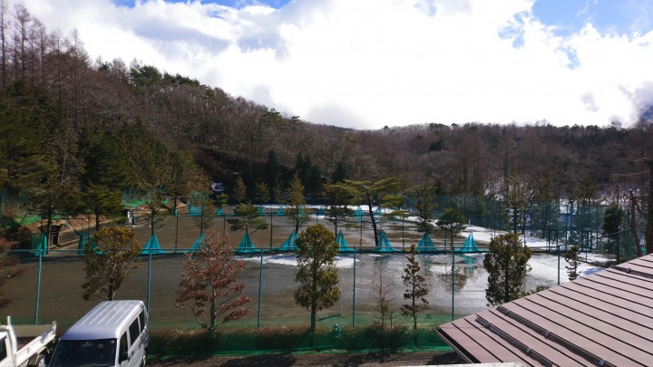 朝方雨が降った山中湖ですが、9時からは晴れとなりました。日中は汗ばむ陽気となり2月中旬にもかかわらず、最高気温は17.2℃、これは5月下旬並みの陽気となりました。写真は正午のテニスコートです。雪がかなり解けました。暖冬のシーズンですがここまで暑いとは異常気象ですね。最低−0℃。