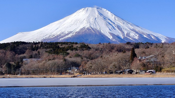 今日の富士山、山中湖は少し凍ってます。