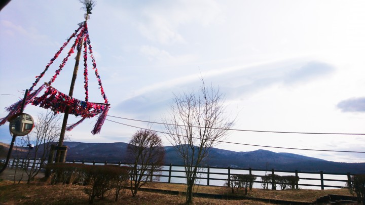 現在、山中湖平野交差点隣の公園ひらりには高さ25mの大きな御神木が建てられています。この御神木は19日早朝に倒されますので、建てられている期間はあと3日だけですのでお早めに訪れてみてください。真後ろには富士山が見え、とても写真映えすると思います。今日の山中湖は曇り時々晴れ、最低−6℃最高3℃