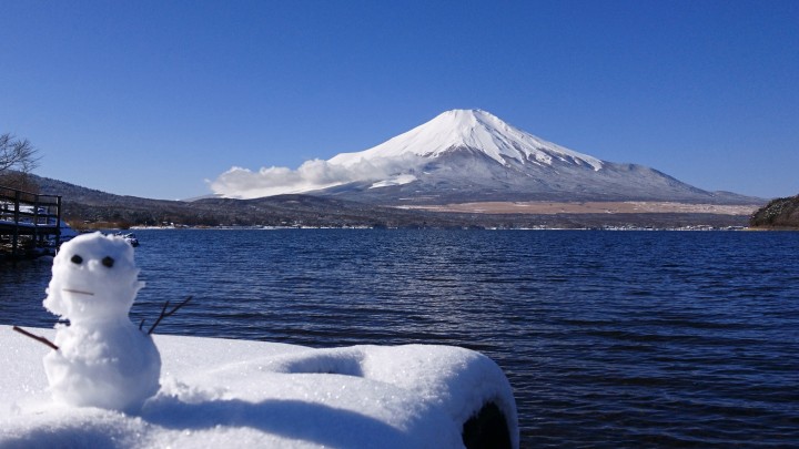 今日の山中湖は晴れ、今朝の最低−9℃、最高4℃。昨日山中湖で降った雪は15?、青空の下、辺りは一面銀世界に変わりました。写真は朝10時、山中湖平野の浜に行き富士山を撮りました。裾まで雪があって冬山と変わっていました。ついでに小さいですが雪ダルマを作ってみました。令和2年初の「富士山と雪だるま」です。雪が積もったらまた作ってみたいと思います。