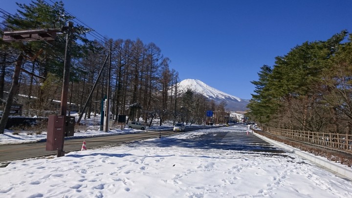 写真は山中湖旭ヶ丘の無料駐車場です。現在、新しく整備が進められている最中ですが、この場所はすでに完成した場所です。午前10時30分、隣接している国道413号線には雪はありませんが、駐車場にはまだまだ雪があります。ご利用の際はスリップに注意して下さいね。この場所からも富士山が見ることはできます。今日の山中湖は晴れ、最高7℃最低−7℃
