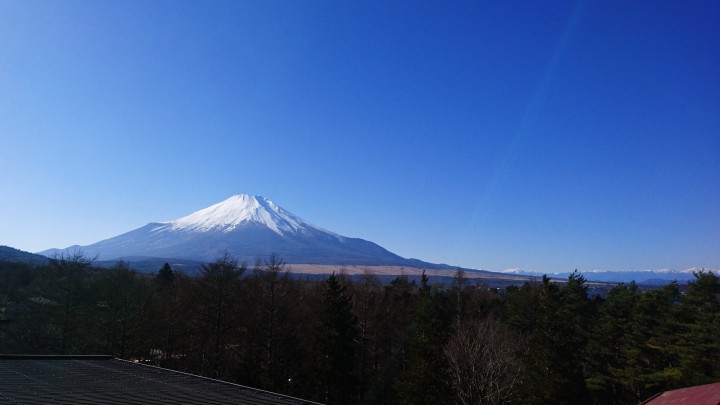 今朝は−6℃まで冷え込んだ山中湖、日中はよく晴れて青空が広がりました。写真は12時30分、共立テニスロッヂの屋根の上から撮った富士山です。屋根掃除のために上ったのですが、富士山とその右に位置した南アルプスまでくっきりと見えました。空気が澄んでいるので、とてもきれいでした。日中の最高気温は9℃、日差しがあって暖かい1日でした。今日の日没は、当館で午後4時2分、一気に冷え込みました。