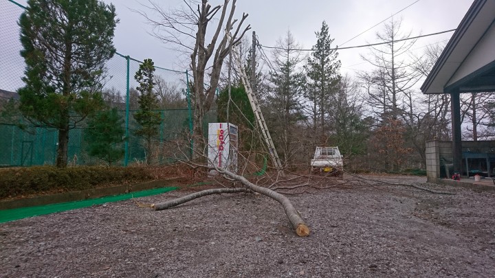 今日の山中湖は朝から日差しがなく、午前中は雪もぱらつき寒い1日でした。今朝の最低は12月上旬並みの−4℃でしたが、最高は1月上旬並みの5℃でした。特に午前中は2℃で顔が痛かったです。写真は外の販売機前の欅を剪定しているところです。枝がかなり広がっていたので、空がよく見えるようになりました。