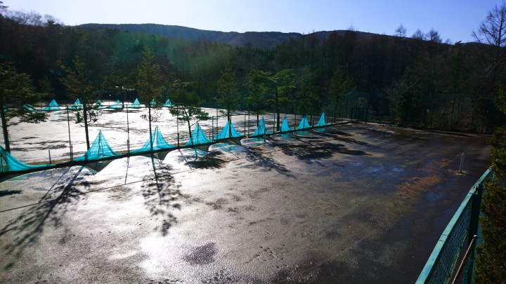 昨日から冬の寒さになった山中湖、今朝の最低気温は12月中旬並みの−6.7℃まで冷え込みました。今季最低です。日中はよく晴れましたが、最高気温も12月中旬並みの6.6℃、日差しがあればいいのですが、少し木陰に入ると空気が冷たいです。写真は朝9時30分の当館テニスコートです。日差しで霜が解けて光っています。まるで、雨上がりのようなテニスコートのようですね。