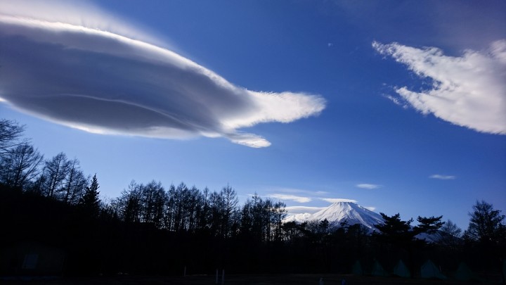 2019年も今日から12月となりました。残り1カ月、暖かい日が続くといいですね。今日の山中湖は晴れ、10時ころから強風が吹きました。富士山には大きなつるし雲が現れ、刻々と雲の形が変わっていきました。写真は13時のテニスコートから見た富士山です。山頂には傘雲、手前には巨大なUFOみたいなつるし雲が現れました。雲の変化がとても面白い1日でした。今朝の最低−5℃、最高13℃。