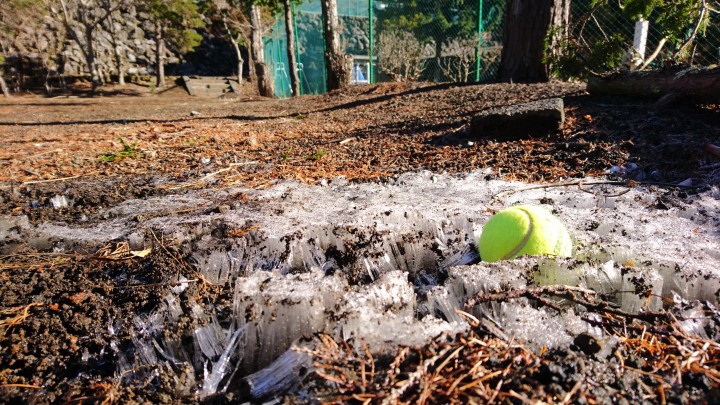 今日の山中湖は晴れ、今朝は−5℃まで冷え込みました。最高気温は9℃。写真は当館の?8テニスコート脇のレクレーション広場です。見事な霜柱を発見しました。比較にテニスボールを置いてみましたが、半分くらいボールが隠れました。冬ですね。