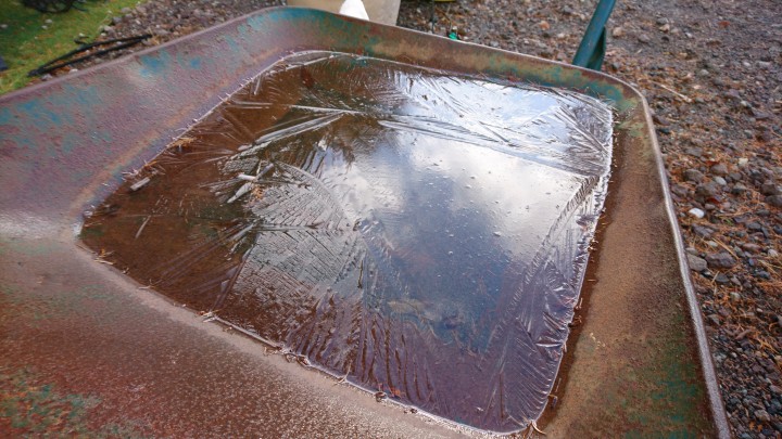 今日の山中湖は晴れ、日中はよく晴れました。最高気温は11℃で、日差しを浴びればポカポカですが、だいぶ風は冷たくなってきました。今朝の最低は今季最低の-2.9℃、一輪車にたまっていた雨水も凍っていました。いよいよ冬に向かって寒くなってきた山中湖です。