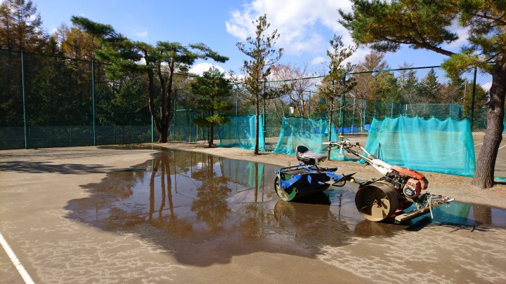 テニスコート転圧ローラの水抜きを行いました。