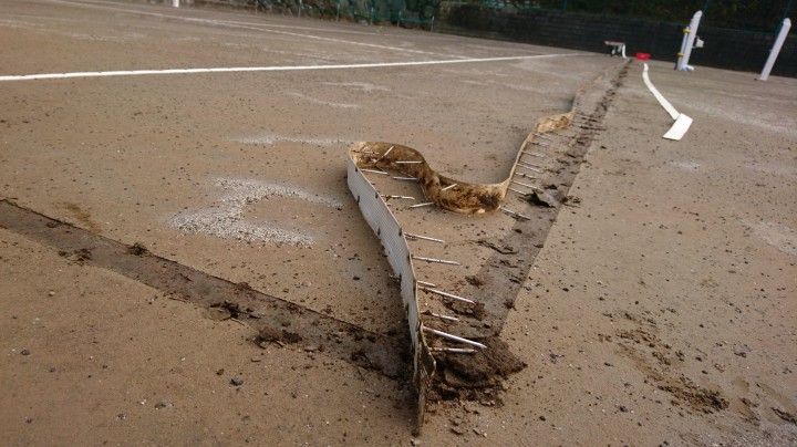 テニスコートのラインテープを取り外し中です。